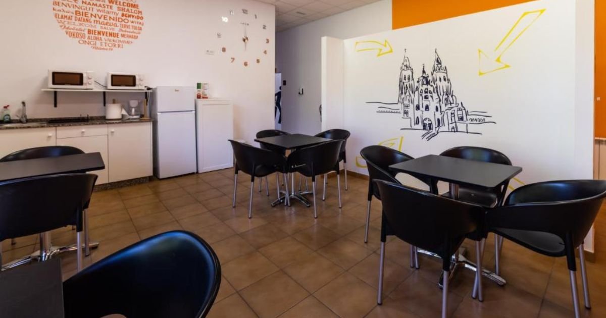 Las zonas comunes están diseñadas para la convivencia y el intercambio entre peregrinos: una sala de estar amplia, espacios de comedor y una terraza exterior donde disfrutar del aire fresco de Galicia. El edificio combina modernidad y sencillez, garantizando un ambiente acogedor.